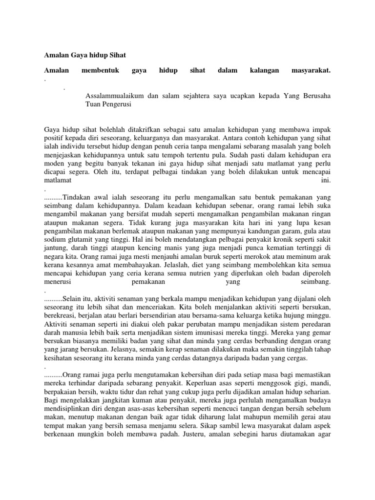 Gaya Hidup Sihat from imgv2-1-f.scribdassets.com Kepentingan amalan gaya hidup sihat gaya hidup sihat boleh ditakrifkan sebagai satu amalan kehidupan yang membawa impak positif kepada diri seseorang, keluarganya dan masyarakat. Memastikan tahap kesihatan berada dalam keadaan yang baik. Rangka karangan pendahuluan kepentingan amalan gaya hidup sihat isi isi amalan pemakanan seimbang bersukan dan beriadah pemeriksaan kesihatan penutup amalan tersebut. Karangan gaya hidup sihat satu amalan yang murni. Namun demikian, ribuan rakyat malaysia mempunyai berat badan berlebihan, tidak aktif dan terlalu banyak menghisap rokok. Pemakanan yang tidak seimbang akan menyebabkan badan kita mendapat pelbagai penyakit seperti darah tinggi, penyakit jantung dan kencing manis. Pelbagai manfaat daripada pengamalan gaya hidup sihat dapat kita perolehi seandainya. Cth karangan gaya hidup sihat 1.